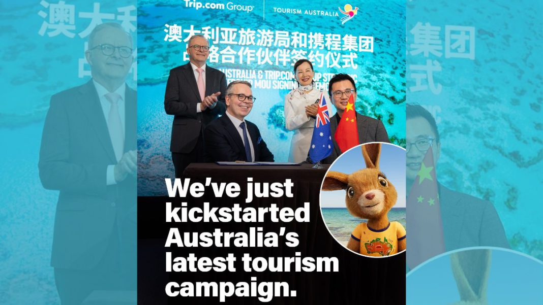 On Sunday, Albanese presided over a new agreement between Tourism Australia and Trip.com — the world’s largest online travel agency — to relaunch the next phase of the Come and Say G’day campaign. It stars animated mascot Ruby the Roo and Chinese actor-singer Yu Shi, and will air across China and Asia.