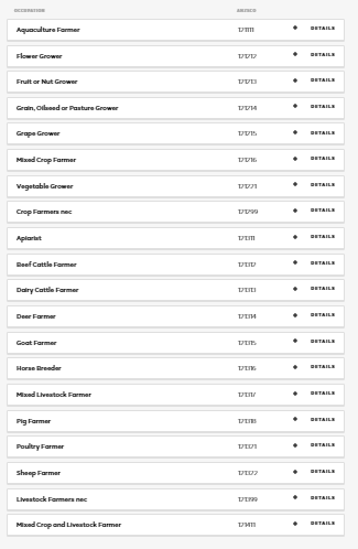 The occupation list includes twenty types of Farmers and Farm Managers.