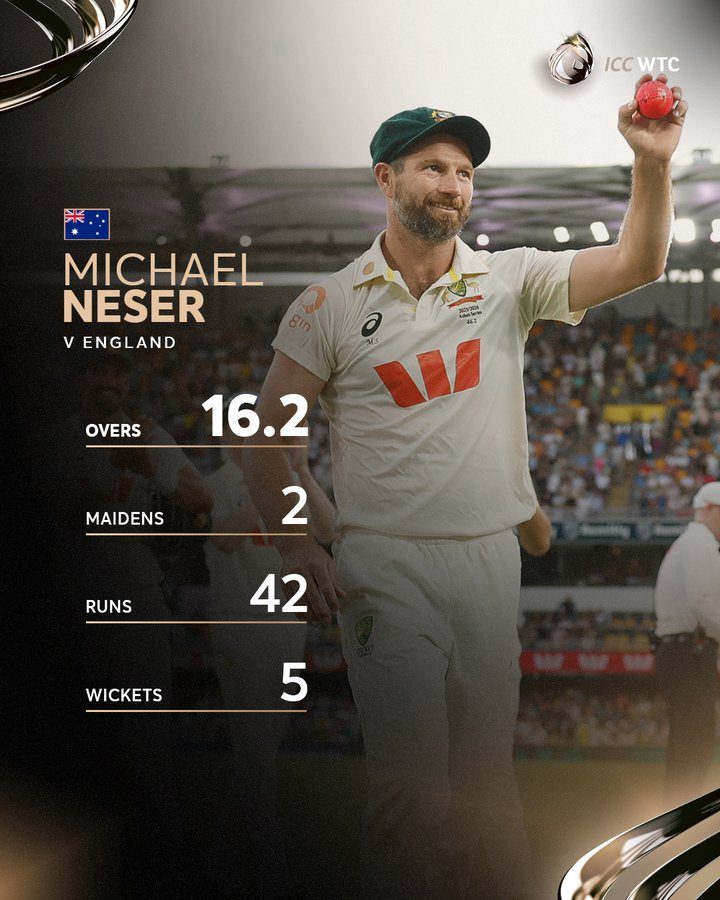 But the real story of Brisbane was Michael Neser. Picked ahead of veteran spinner Nathan Lyon in a bold selection call, the 34-year-old Queensland quick grabbed his first Test five-wicket haul, taking 5-42 in England’s second innings and shredding what remained of their resistance.