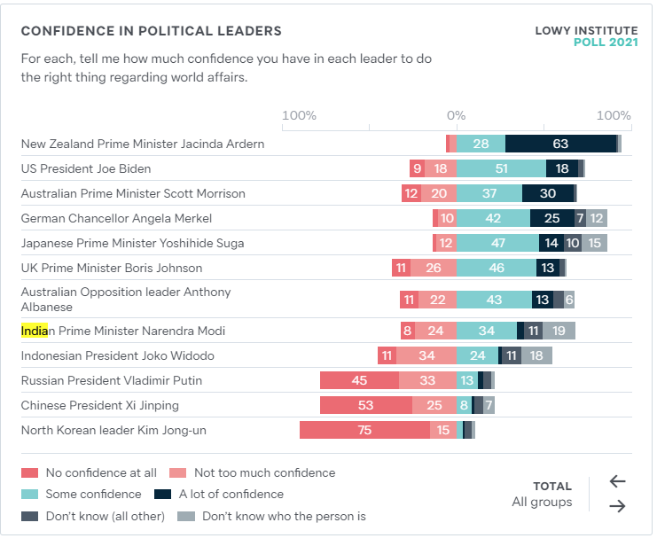 34 per cent had some confidence and 4 per cent lot of confidence respectively in India’s Prime Minister Narendra Modi to do the right thing regarding the world affairs.