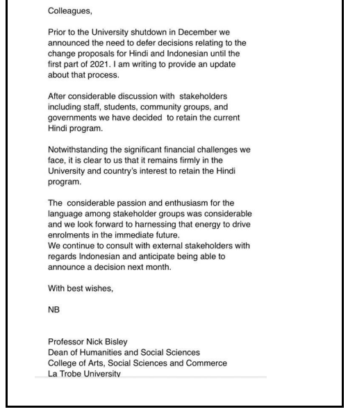 After almost two and a half months of advocacy by multiple stakeholders within the Indian Australian community, finally, the good news of retaining the ‘Hindi language course’ at La Trobe University was received with jubilations.