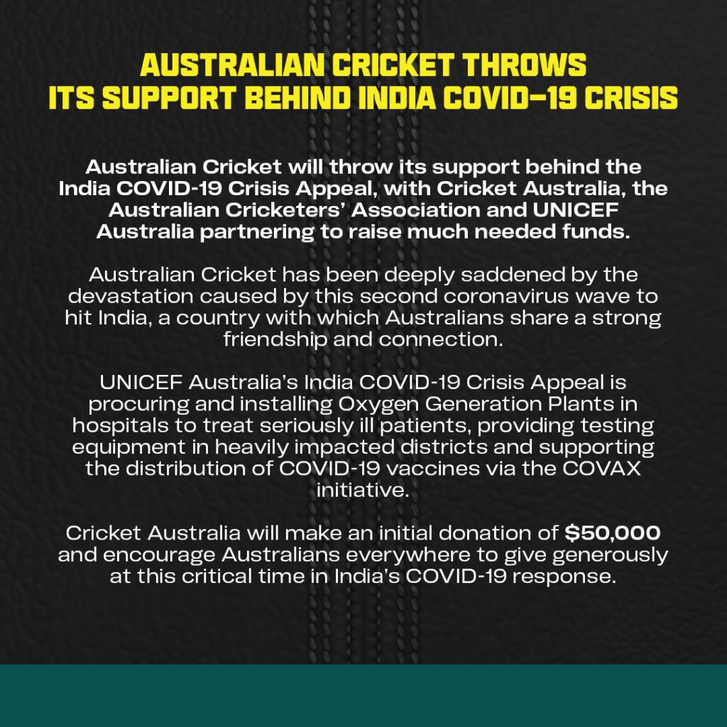 Cricket Australia will make an initial donation of $50,000 and encourage Australians everywhere to give generously at this critical time in India’s COVID-19 response.