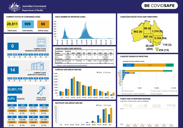 As of 31st January 2021, there have been 28811 confirmed cases of the virus in Australia and 909 of these have died. Infographic below from Department of Health indicated situation in various states and also other trends.