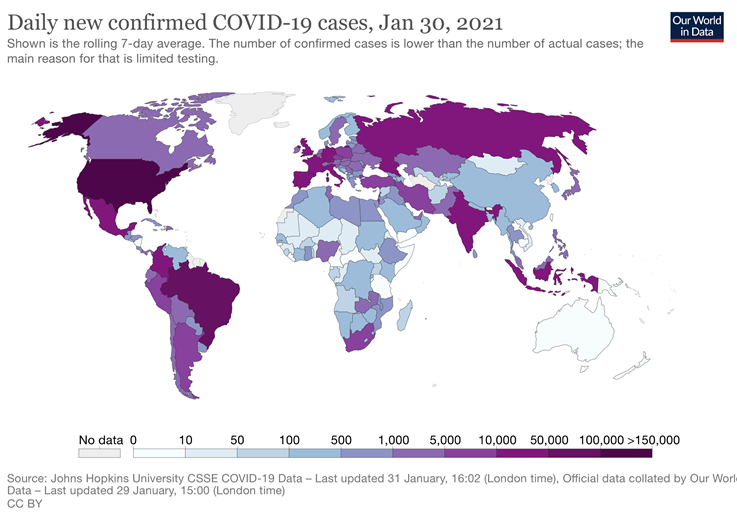 As of 10 January 2021, there were 88,828,387 laboratory-confirmed cases of coronavirus disease 2019 (COVID-19) infection globally, with 1,926,625 reported deaths. The number of cases and deaths outside of China overtook those within the country on 16 March 2020.