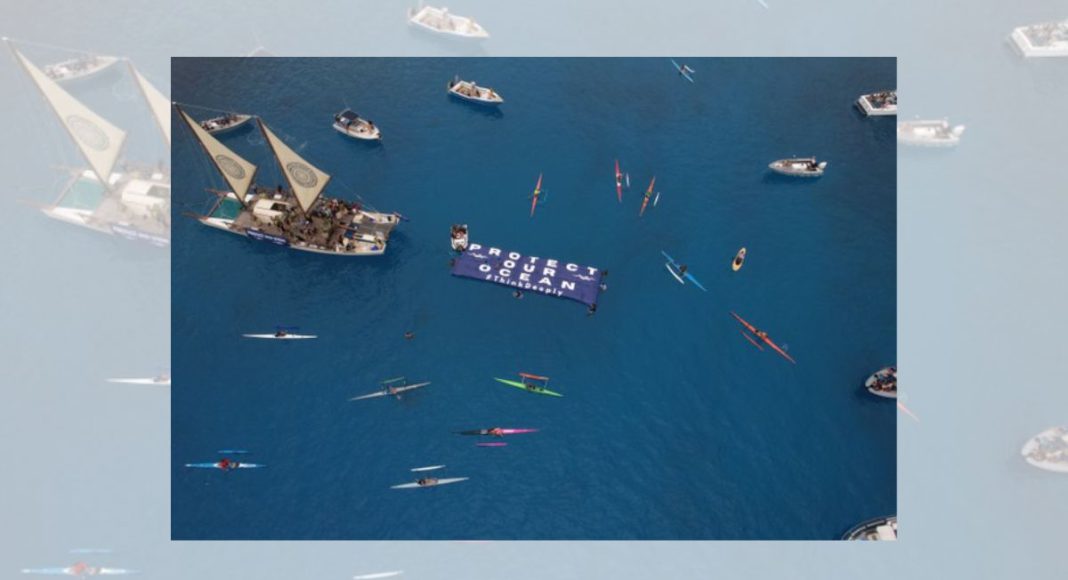 “Protect Our Ocean, #Think Deeply,” declared a 75-square meter sign floated in Avarua Harbour Wednesday by a flotilla of several hundred Cook Islanders who took to the water in a traditional double-hulled vaka, kayaks, jet skis and other vessels.