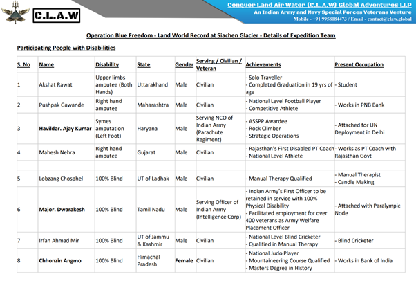 Team Claw aims to create a triple world record on land, air, and water. They created their historic world record on land on 11th September 2021 with the largest team of People with Disabilities climbing the Siachen Glacier.