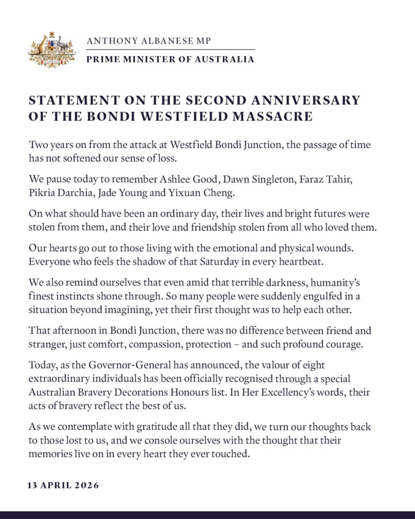Eight people who showed extraordinary courage during the 2024 Bondi Junction stabbing attack have been recognised in a special Australian Bravery Decorations honours list, announced on the second anniversary of the tragedy.