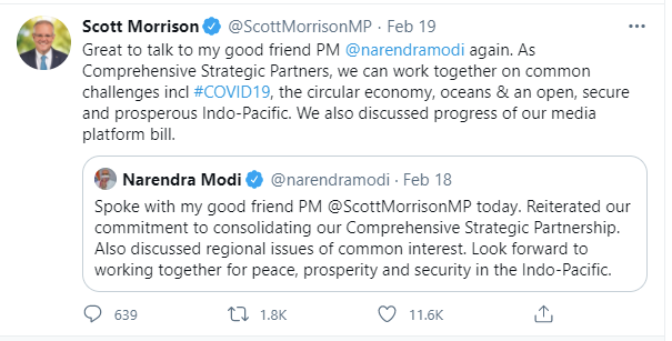 They tweeted to work together on common challenges like Covid 19, the circular economy, secure and prosperous Indo-Pacific as comprehensive strategic partners.