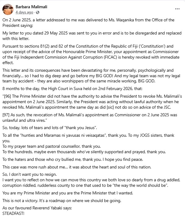 In a statement acknowledging the judgment in HBJ 5/2025 Barbara Malimali v The President of Fiji and Others, the government said it had accepted the court’s findings after taking legal advice and consulting President Ratu Naiqama Lalabalavu. While the original decision to revoke Malimali’s appointment was made on advice from senior legal counsel, the government said it respected the court’s conclusion and would not challenge it on appeal.