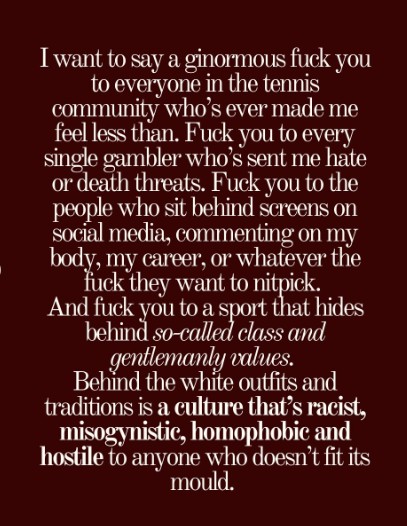 In a raw and expletive-filled social media statement posted online, the 25-year-old likened tennis to a “toxic boyfriend” and launched a scathing attack on what she described as a culture that is “racist, misogynistic, homophobic and hostile to anyone who doesn’t fit the mould”.