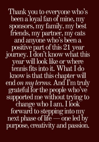The most forceful passages of her retirement message were directed at members of the tennis community, online trolls and gamblers who she said subjected her to abuse and threats.