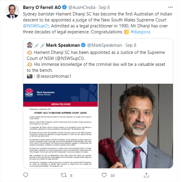 “This is a significant appointment as he is the first Australian of Indian descent to be appointed to the NSW Supreme Court and one of only a few Australians with Asian heritage to be appointed as a judge of an Australian superior court.”