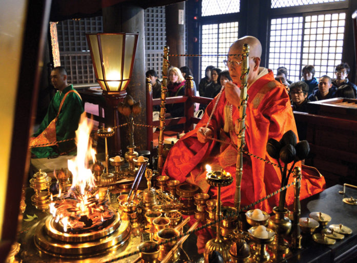In the prayer books, mantras are written both in Sanskrit and in Japanese ‘Kana’. ‘Kana’ is based on the phonetics of Sanskrit and this makes it possible for the priests to chant the mantras perfectly.