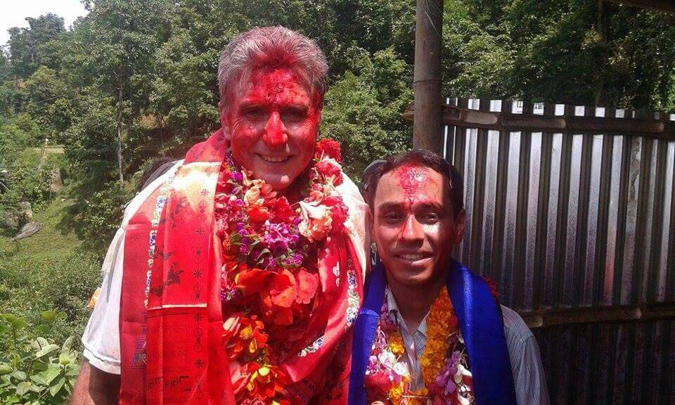Image: Ben and Mahesh receiving Tika as a welcome from villages (Source: Facebook – Chaughada Progressive English School)
