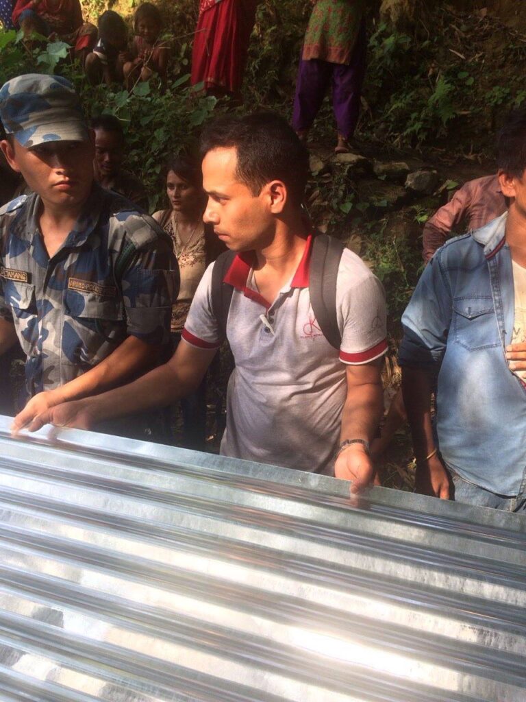 Image: Donation of corrugated tin sheeting to 65 households left homeless in the aftermath of the devastating earthquakes that struck Nepal in 2015 (Source: Facebook – Chaughada Progressive English School)