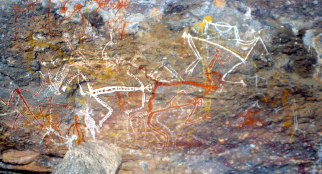 Depictions of “Wandjina” spirits come from the Kimberley coast in northern Western Australia. The Wandjina are the most powerful creation spirits, symbolising rain. They are often depicted with bodies of dots, representing rainfall.