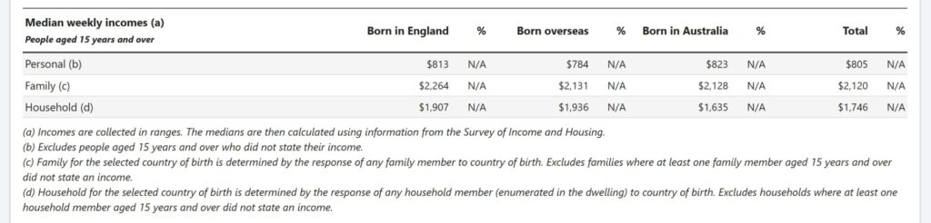 Median weekly incomes of England-born, Screenshot ABS. “England‑born” refers specifically to people born in England and does not include those born in Scotland, Wales, or Northern Ireland. Median personal, family, and household incomes for Scotland, Wales, and Northern Ireland‑born residents are lower than those for England‑born residents and significantly below India‑born residents in Australia.