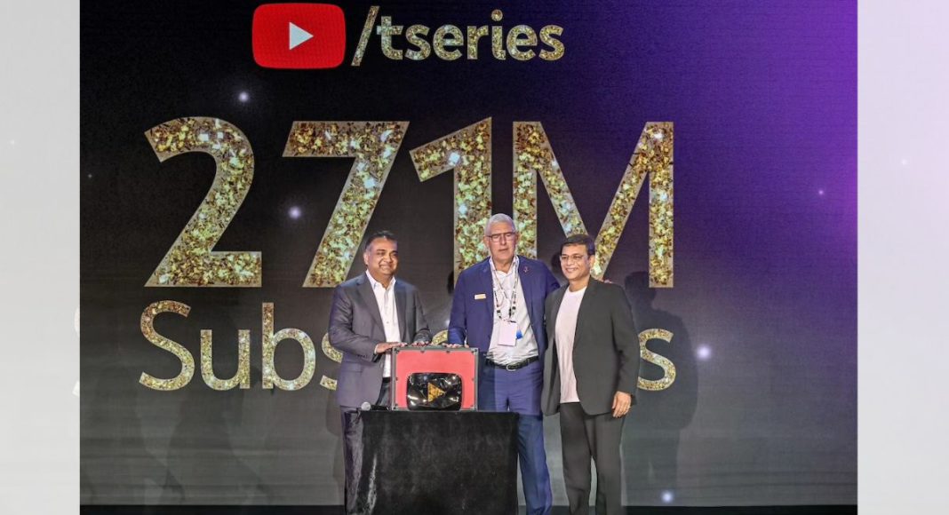 A custom-made creator button from YouTube’s CEO, Neal Mohan, and Global Head of Music, Lyor Cohen was presented to T-Series’ Bhushan Kumar.