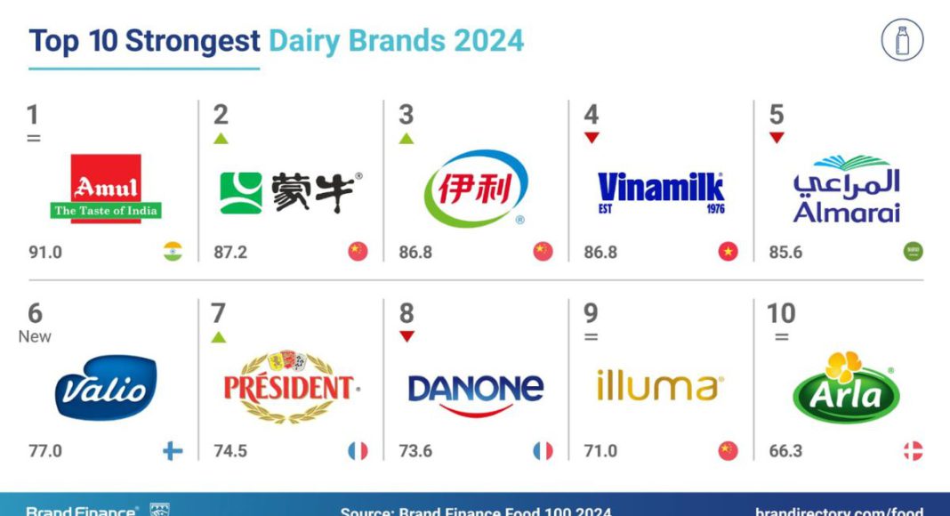 Amul, a renowned dairy brand from India, has secured the top position as the world’s strongest food brand. With a Brand Value of USD 3.3 billion, Amul boasts a Brand Strength Index (BSI) score of 91.0 out of 100 and an impressive AAA+ rating.