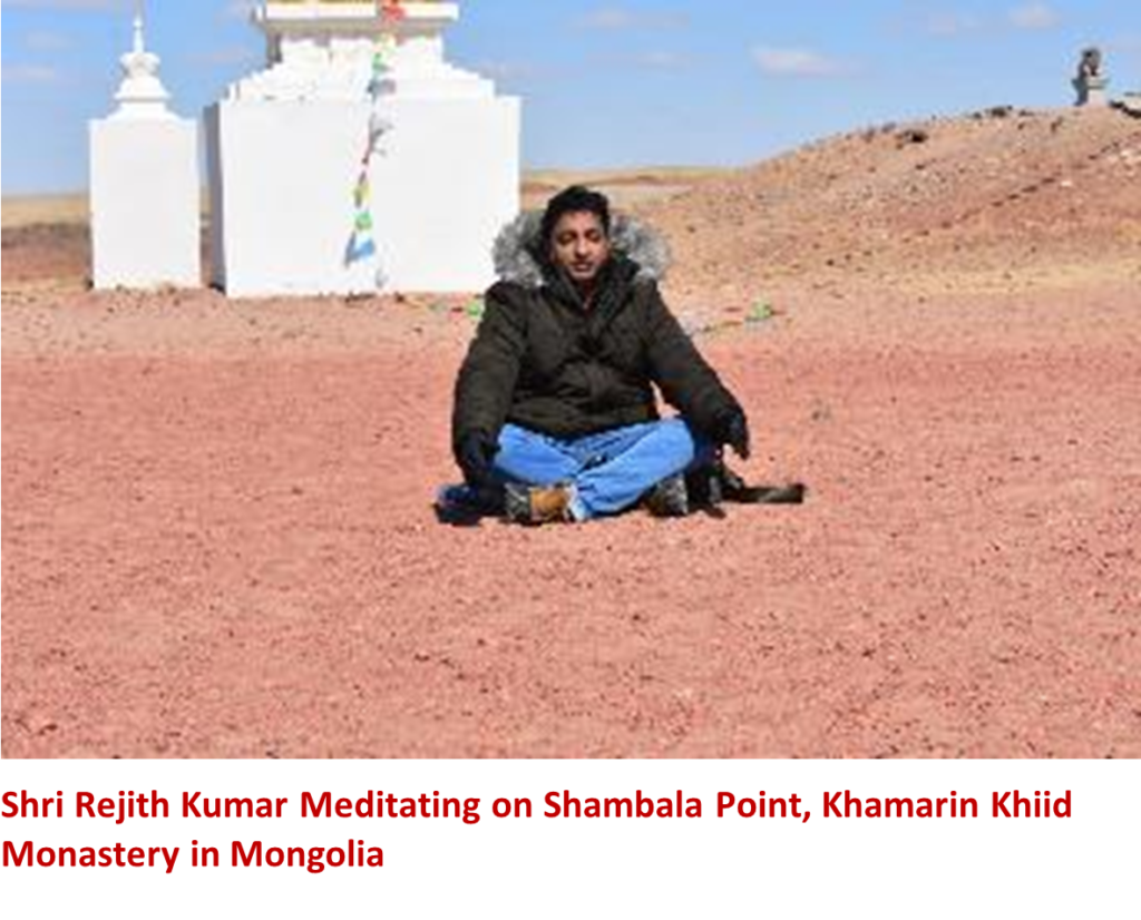 Rejith Kumar says he was intuitively guided to visit many energy points in various countries through visions. These would give him the necessary clues as to the identity of the location. Some of which include – Russia, China, Thailand, the Mac Ritchie Reservoir (Singapore), Blue Mountains and Lion Island (Australia), Dragon Hill and Silbury Hills (U.K.), Plaine de Sables and Piton de la Fournaise (Reunion Island), Khamrin Khiid Monastery (Mongolia), Fushimi Inari Temple (Japan), Kathirkamam (Sri Lanka), Tiger Nest (Bhutan), Pura Besakih Temple (Bali), Aivar Malai, Anjaneyar Malai, Kannivadi Hills, Poombarai, and Ujjain (India).