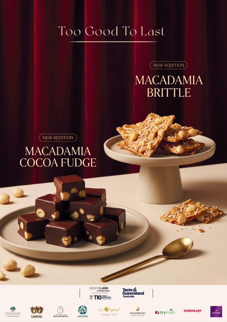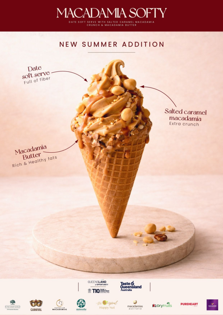 At the centre of the activation is a layered dessert featuring a date-based ice cream, blended with macadamia butter and topped with salted caramelised macadamia brittle. Organisers say the concept is intended to highlight the nut’s creamy texture and versatility in a format familiar to local consumers.