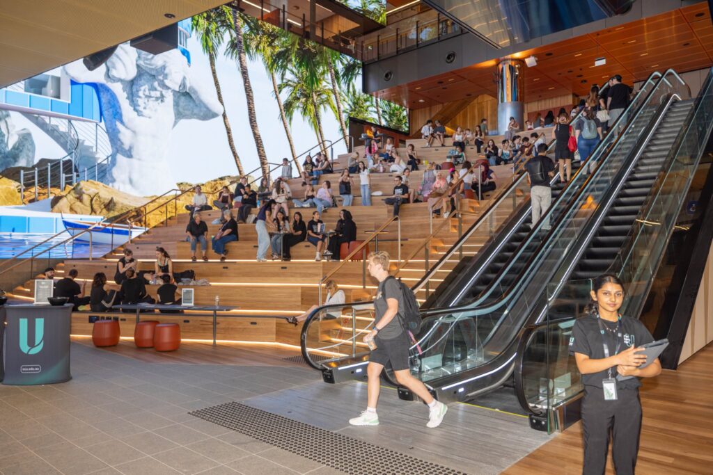 The campus features state-of-the-art teaching facilities, specialist business, law, creative arts and technology spaces, advanced screen and media production facilities, and extensive student support and wellbeing services. Eight public performance venues are expected to host more than 300 performances annually, while the main foyer boasts one of the Southern Hemisphere’s largest indoor LED displays, delivering immersive digital content year-round. Its distinctive media façade, spanning two sides of the building, will turn the structure itself into a creative canvas for students, staff and the public.
