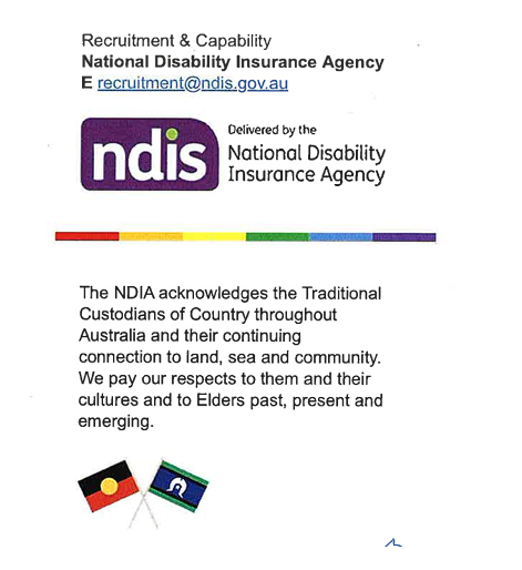 Email signatures circulated alongside her post show NDIA branding accompanied by the Aboriginal and Torres Strait Islander flags and an Acknowledgement of Country, without the Australian national flag or Commonwealth crest.
