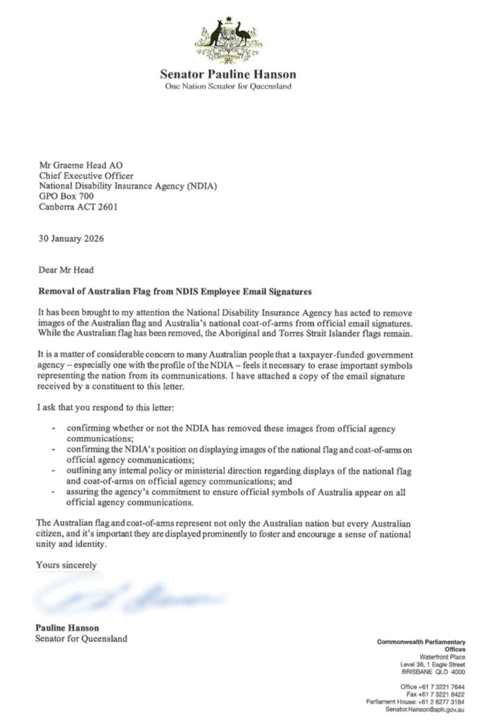 In a letter dated 30 January, the One Nation senator said she had been alerted to changes in NDIA email footers that no longer display national symbols, while retaining the Aboriginal and Torres Strait Islander flags.