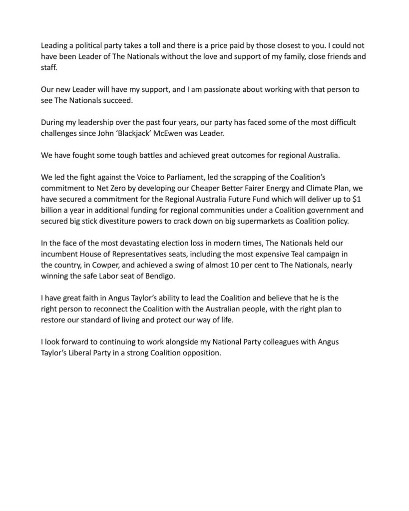 The resignation sets the stage for a competitive leadership contest as the Nationals seek a new figure to guide the party through ongoing challenges in regional electorates and within the Coalition.