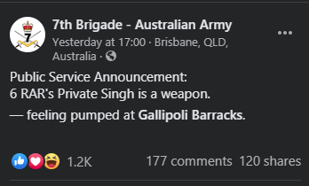 The 7th Combat Brigade of the Australian Army based at Gallipoli Barracks in Brisbane, Queensland, recently shared a Facebook post.