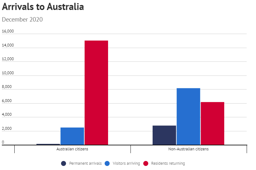 Figures from the Australian Bureau of Statistics show 10,640 incoming passengers to Australia marked “visitor” on their entry card in December 2020.