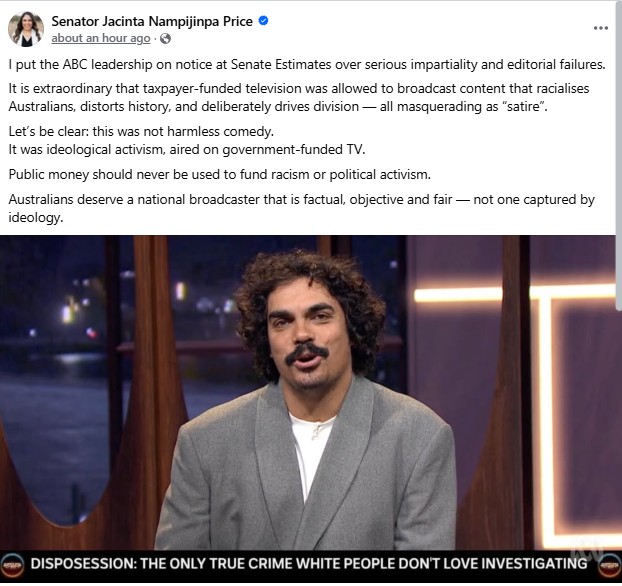 Senator Price argued it was unacceptable for taxpayer-funded television to broadcast content that “racialises Australians, distorts history and deliberately drives division”, dismissing claims the material was merely satire. “Let’s be clear: this was not harmless comedy,” she wrote.