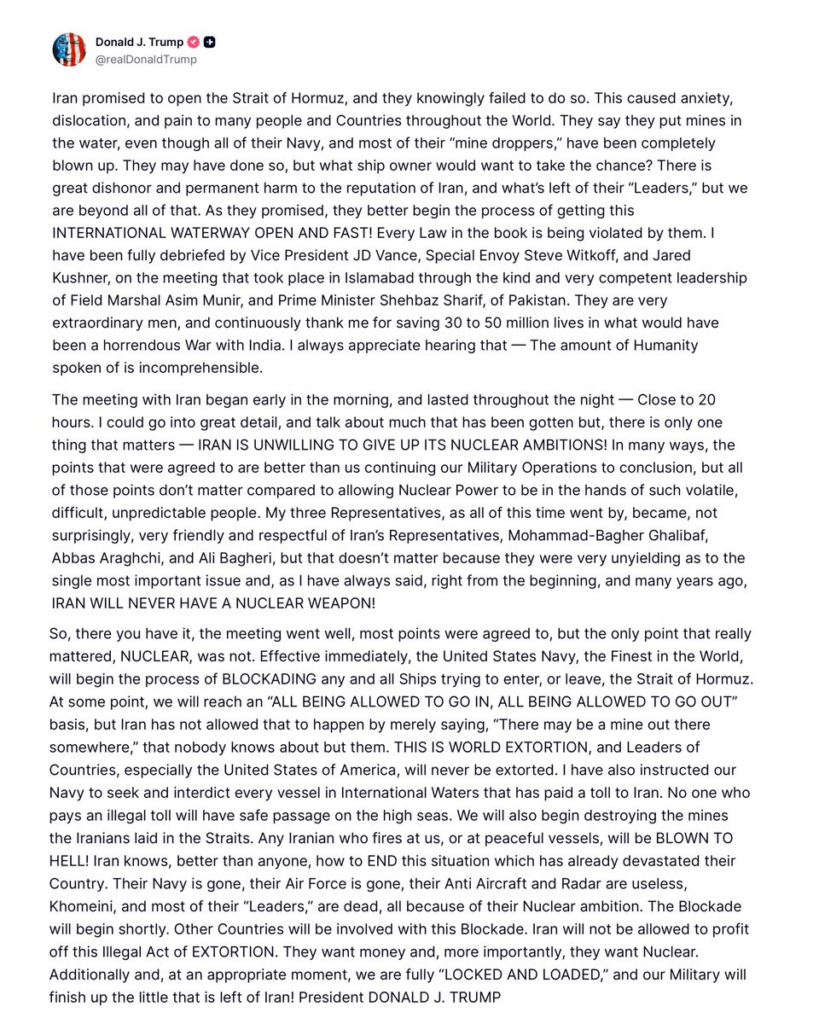 “Effective immediately, the United States Navy, the Finest in the World, will begin the process of BLOCKADING any and all Ships trying to enter, or leave, the Strait of Hormuz,” he wrote, adding a stark warning that any Iranian aggression would be met with overwhelming force.